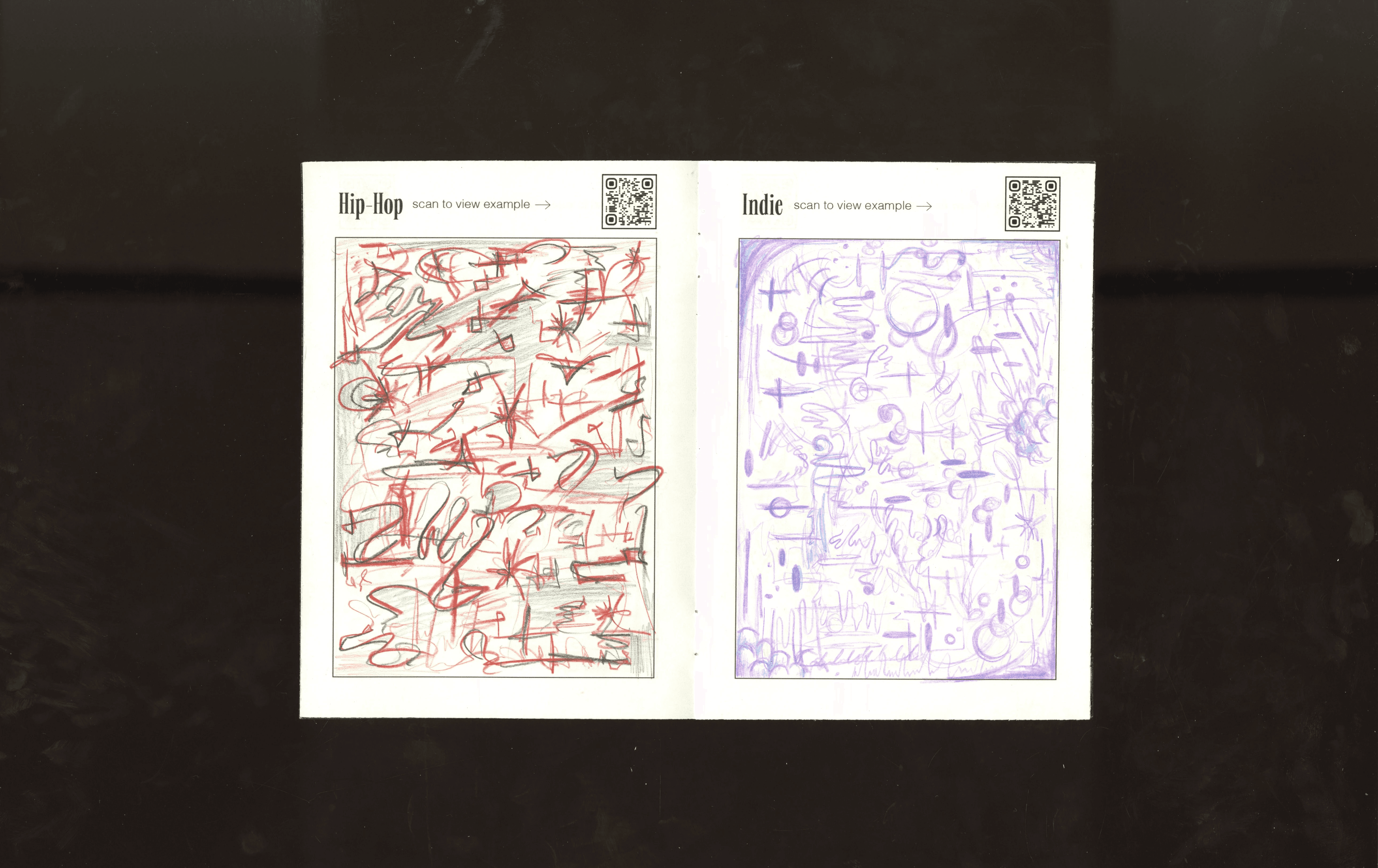 For this project, I was influenced by my own tendency to listen to music while creating and I wanted to see if there was a correlation between the music people listen to and their visual ouputs. I designed what I like to call a scribble-book as a space for people to mindlessly draw as they listen to specific genres of music. I ended up gathering some of my classmates' drawings through a survey and placed them in a virtual gallery using OnCyber. Here is a look at the booklet, the gallery space, and one example of the drawings I collected.